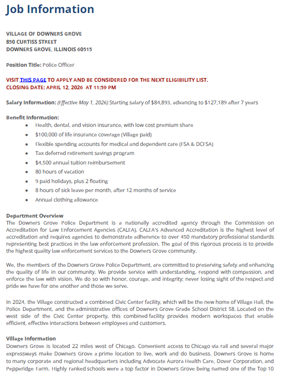 Attached is the job posting for the Chief of Police position in St. Jacob. Their employee application can be found online at www.stjacobil.com/forms. Applicants can either turn it into the Village Hall or submit their application to our clerk: clerk@stjacobil.us.