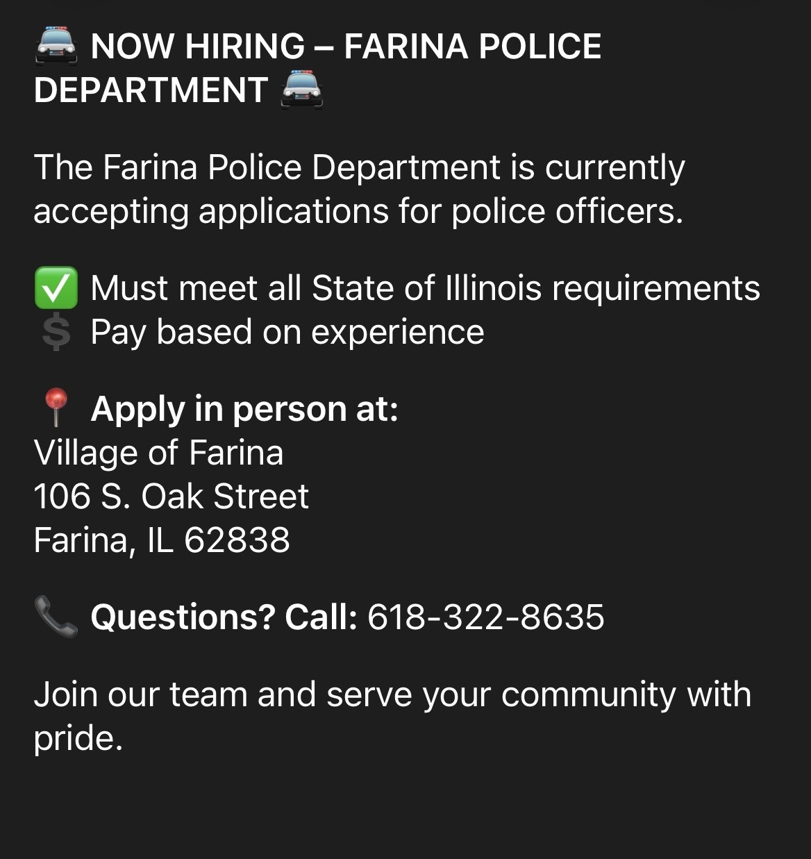 The City of La Harpe is currently accepting applications for an Illinois Certified full-time Police Chief. Applications must be received by June 6th, 2025 at 5pm. The Police Chief position is open to Illinois certified officers who have at least 2 years of experience, are currently, or were previously, employed as a police officer. A background check and an oral interview will be given prior to consideration for employment with the City of La Harpe. All applicants must be able to perform normal police duties daily. You will not be considered for employment if you have had a DUI, any domestic battery, or similar offenses.