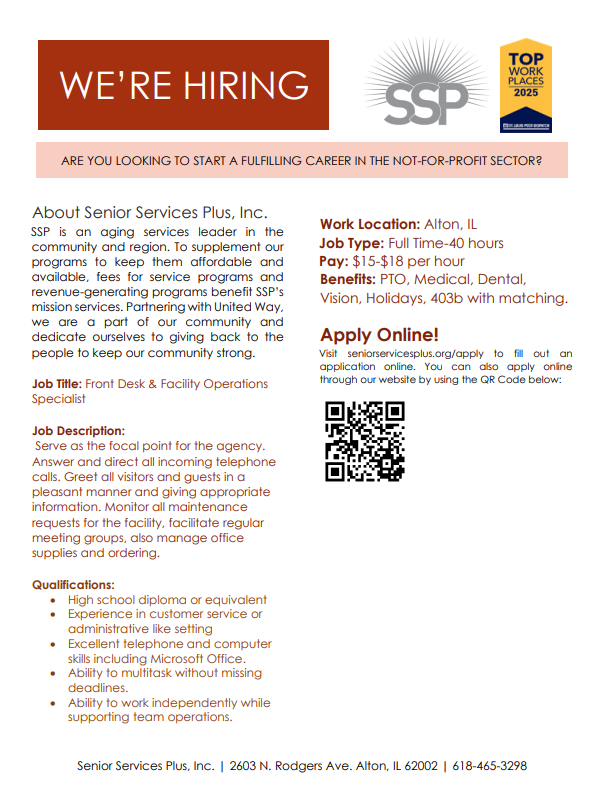 Front Desk & Facility Operations SpecialistBy John Suarez / March 16, 2026 Closing on: Apr 18, 2026Job Field: Business Job Shift: Full Time Job Location: Alton IL