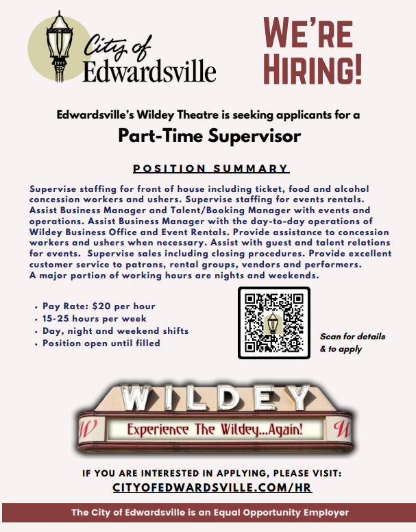 Part-Time Supervisor – Wildey TheatreBy John Suarez / February 18, 2026 Closing on: Mar 21, 2026Job Field: Business Job Shift: Part Time Job Location: Edwardsville IL