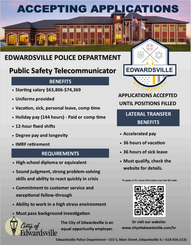 Public Safety TelecommunicatorBy John Suarez / January 7, 2026 Closing on: Feb 7, 2026Job Field: Law Job Shift: Full Time Job Location: Edwardsville IL