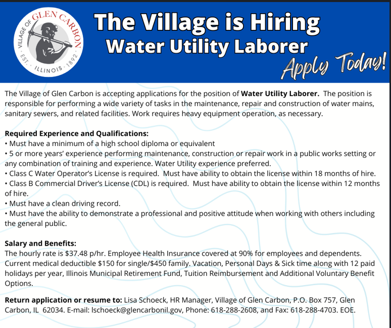 Water Utility LaborerBy John Suarez / January 7, 2026 Closing on: Feb 7, 2026Job Field: Construction / Trades Job Shift: Full Time Job Location: Glen Carbon IL