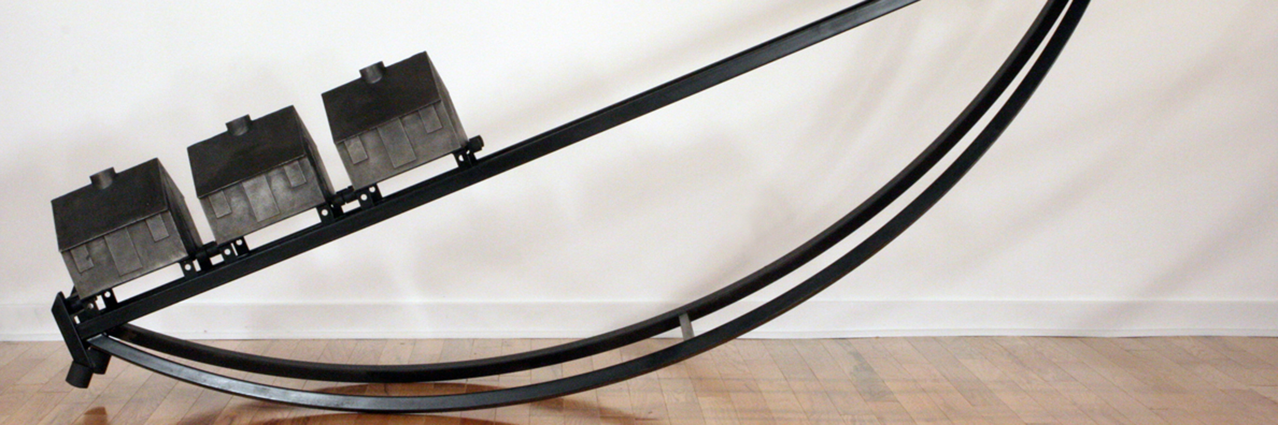Non-objective paintings of thickly applied color are balanced with sculptures that combine mathematical relationships with mechanical precision.